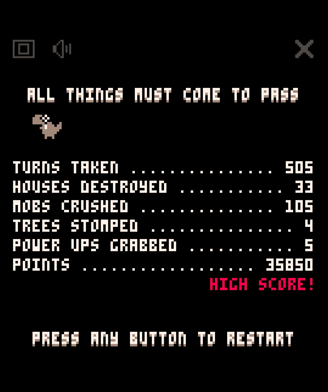 You are one big monster with an appetite for destruction. This turn-based rogue-like PICO-8 game is all about that stomping, smashing, grabbing, and chomping your way through a procedurally generated hapless city and its tiny citizens.